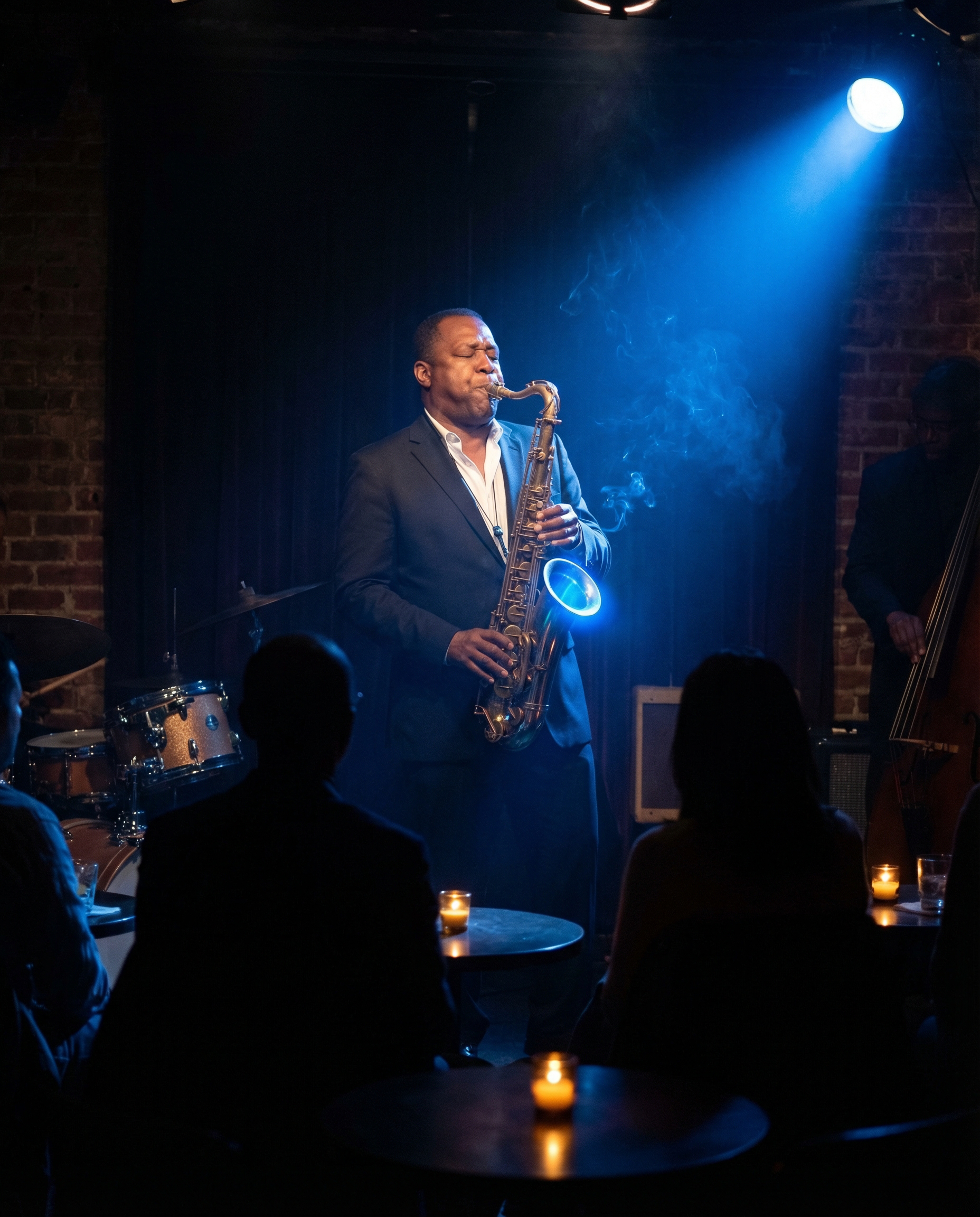SHOT: Medium shot from behind the audience, looking toward a small stage. A saxophone player stands in a single blue spot. Cigarette smoke drifts through the light beam. SUBJECT A saxophone player — a man in his fifties, African American, wearing a dark suit, white shirt with open collar, no tie. He plays tenor saxophone — the brass catches the blue stage light as a bright curved highlight along the bell. His eyes are closed. His cheeks puffed slightly with the embouchure. His fingers work the keys — dark shapes against bright brass. Expression: Eyes closed, transported — not performing for the audience, inside the music. Body leans slightly back, weight on heels. SCENE A small jazz club — capacity 60. Small round tables with candles in the dark foreground. The audience visible as dark shapes and occasional candle-lit faces. The stage is tiny — barely room for a quartet. Drum kit and upright bass visible at stage edges, slightly out of the spot's reach. Exposed brick walls. Low ceiling with acoustic tiles. CINEMATOGRAPHY Lighting: One blue-gelled spot from above-right — tight, hitting only the saxophonist. The blue light catches the brass, his face, and the rising smoke. Candles on tables provide tiny warm amber points in the dark audience area. Contrast: cold blue stage, warm amber audience. Smoke from the crowd drifts through the blue spot beam — visible as slow-moving grey-blue wisps. Tone: Blue spot on stage, warm amber candle points in darkness. STYLE Blue Note Records album cover aesthetic — the musician in blue light. No text, no signage, no writing, no logos, no watermarks.