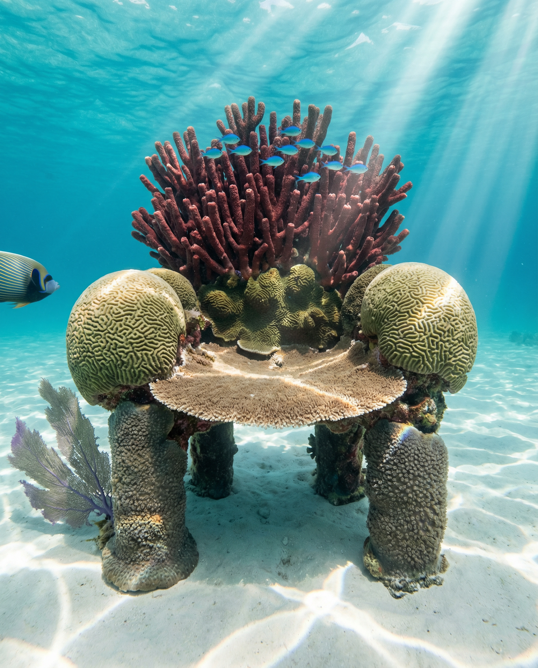 Ultra realistic underwater fantasy photograph, 4:5 vertical. An ornate throne made entirely of living coral, sitting on white sand on the ocean floor in shallow tropical water. MATERIAL PHYSICS — CORAL THRONE: The throne is approximately 5 feet tall — a high-backed ceremonial seat. It is not carved coral — it is GROWN coral. Different species of living coral form different parts of the structure: - Backrest: Branching red organ-pipe coral (Tubipora musica) forms the tall back — hundreds of thin red tubes bundled together, some branching outward at the top like a crown - Armrests: Massive brain coral (Diploria) forms each armrest — the characteristic labyrinthine groove pattern visible on the rounded surfaces, pale tan with green-brown valleys - Seat: A flat plate of table coral (Acropora) creates the seat surface — thin, flat, slightly concave, pale brown - Legs: Four thick pillar coral (Dendrogyra) supports — cylindrical, grey-brown with fine polyp texture visible The coral is ALIVE — tiny polyps are extended on some surfaces, visible as small translucent tentacle clusters. The colors are natural, not day-glo — muted reds, tans, browns, pale greens. This is real reef color, not cartoon reef color. MATERIAL PHYSICS — WATER: Shallow tropical water approximately 15 feet deep — warm, clear, turquoise. The turquoise color comes from white sand reflecting sunlight upward through the water column. Visibility is 80+ feet. The water has slight particulate — not murky, but enough to show the sunlight shafts as slightly brighter diagonal beams entering from the surface above. MATERIAL PHYSICS — LIGHT: Shafts of tropical sunlight penetrate the surface above — three major shafts visible as bright diagonal beams, the edges defined by the particulate in the water. Where a shaft hits the throne, the coral surfaces are brightly lit and their colors saturate. Where the throne is between shafts, the coral is lit by softer ambient underwater light — bluer, dimmer. Caustic light patterns (the dancing ripple-refraction pattern from surface waves) play across the white sand floor around the throne — constantly moving bright lines. MARINE LIFE: A small school of blue chromis (10-12 tiny bright blue fish) hover near the throne's backrest. A single larger angelfish (Emperor angelfish — blue and yellow stripes) passes at the left edge of frame. A sea fan (purple gorgonian) grows from the sand beside the throne, waving slightly in the current. CAMERA: Underwater housing, Nikon Z8, 15mm rectilinear wide angle, f/5.6, ISO 400. Natural light only — no strobes. NEGATIVE PROMPT: person, diver, crown, dark water, murky, deep ocean, cartoon, text, watermark.