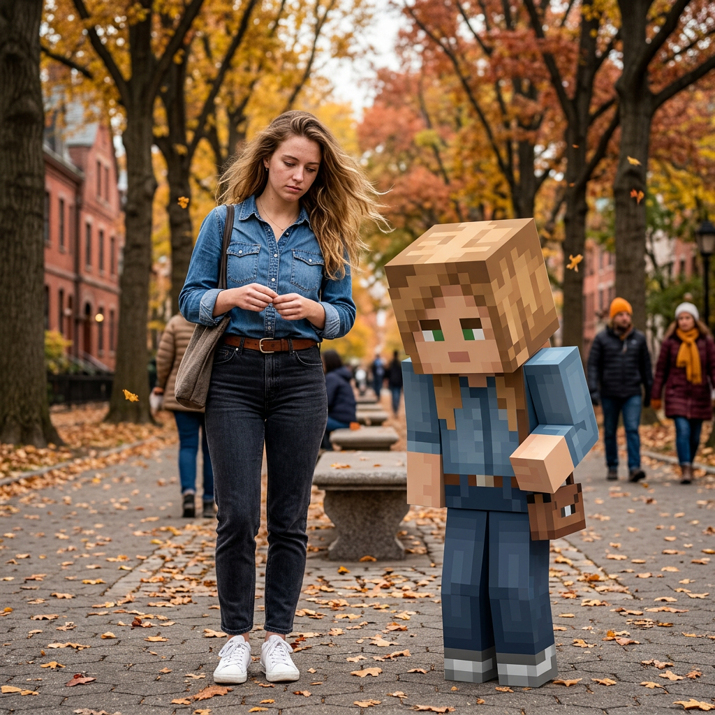 "scene_description": "Это странный, но пронзительный момент из цифровой жизни, подчеркнутый идеальной синхронностью. Молодая женщина замерла посредине спокойной парковой аллеи в осеннем Нью-Йорке, погруженная в размышления о чем-то важном. Прямо рядом с ней, как ее собственное пиксельное альтер-эго из вселенной Minecraft, стоит ее точная копия, повторяющая позу до мельчайшего движения. Они обе смотрят вниз, обе держат свои вещи в идентичных позах, создавая сюрреалистичный и философский дуэт. Кадр снят спонтанно, на смартфон, с типичной для BeRaw спонтанностью, но идеальное зеркалирование между живой, органичной позой и ее угловатым, цифровым воплощением заставляет задуматься о наших двойниках в виртуальном мире. Настроение — задумчивое, немного отчужденное и психоделичное.",