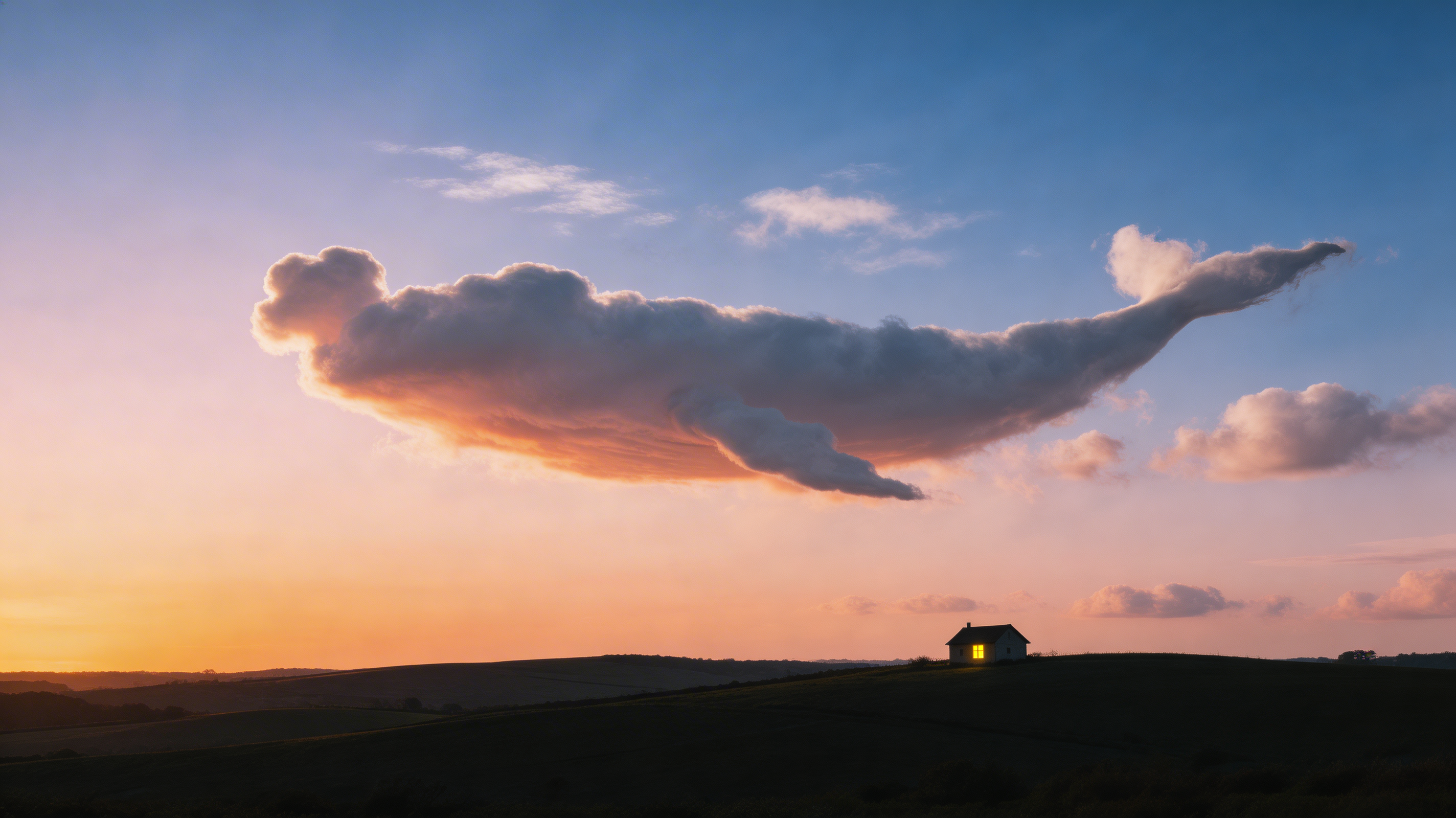 Ultra realistic surreal nature photograph, 16:9 wide. A cloud formation in the shape of a humpback whale swimming through a sunset sky. Natural phenomenon, not illustration. THE CLOUD WHALE: A large cumulus cloud formation that has naturally taken the shape of a humpback whale — body, pectoral fins, tail flukes, the characteristic knobbed head. The whale-cloud is approximately 2 miles long in apparent sky-distance, swimming from left to right across the frame. The form is NOT perfectly detailed — it is a cloud. The body has the soft billowing edges of real cumulus. The tail flukes are slightly tattered where wind has pulled wisps away. The pectoral fin is a protruding shelf of denser cloud. The head shows the general rounded knobbed shape but not individual tubercles — this is a cloud resembling a whale, not a whale made of cloud. CRITICAL: This must look like a REAL CLOUD that happens to look like a whale — the kind of pareidolia photograph that gets shared with the caption "I can't believe what I saw in the sky today." It should NOT look like a CGI whale texture-mapped with cloud material. Other normal clouds surround the whale formation — smaller cumulus, a few wispy cirrus above. These normal clouds prove that the whale-shape is a coincidence, not a design. THE SUNSET: The sky is in full sunset — the western horizon burns deep orange through salmon through pale yellow. Higher up, the sky transitions through pink-lavender to deep blue at the zenith. The whale-cloud catches the sunset light on its underside — warm orange-pink on the belly, while the top surfaces are still lit by the higher blue sky as pale grey-white. The whale appears to be swimming through a sea of orange light. LANDSCAPE BELOW: A simple dark horizon — hills or flat farmland in near-silhouette. A single farmhouse with one lit window provides the only ground-level detail. The landscape is NOT the subject — it exists only to anchor the sky. CAMERA: Canon R5, 70-200mm at 100mm, f/8, ISO 200. The telephoto compresses the cloud against the sunset sky. LIGHTING: Sunset — the sun is below the horizon on the left, its last light painting the clouds from below. The whale-cloud's underside glows warm. Its upper surface is cooler. The contrast defines the whale's three-dimensional form. NEGATIVE PROMPT: CGI whale, solid whale, real whale, ocean, water, cartoon, digital art, text, watermark.