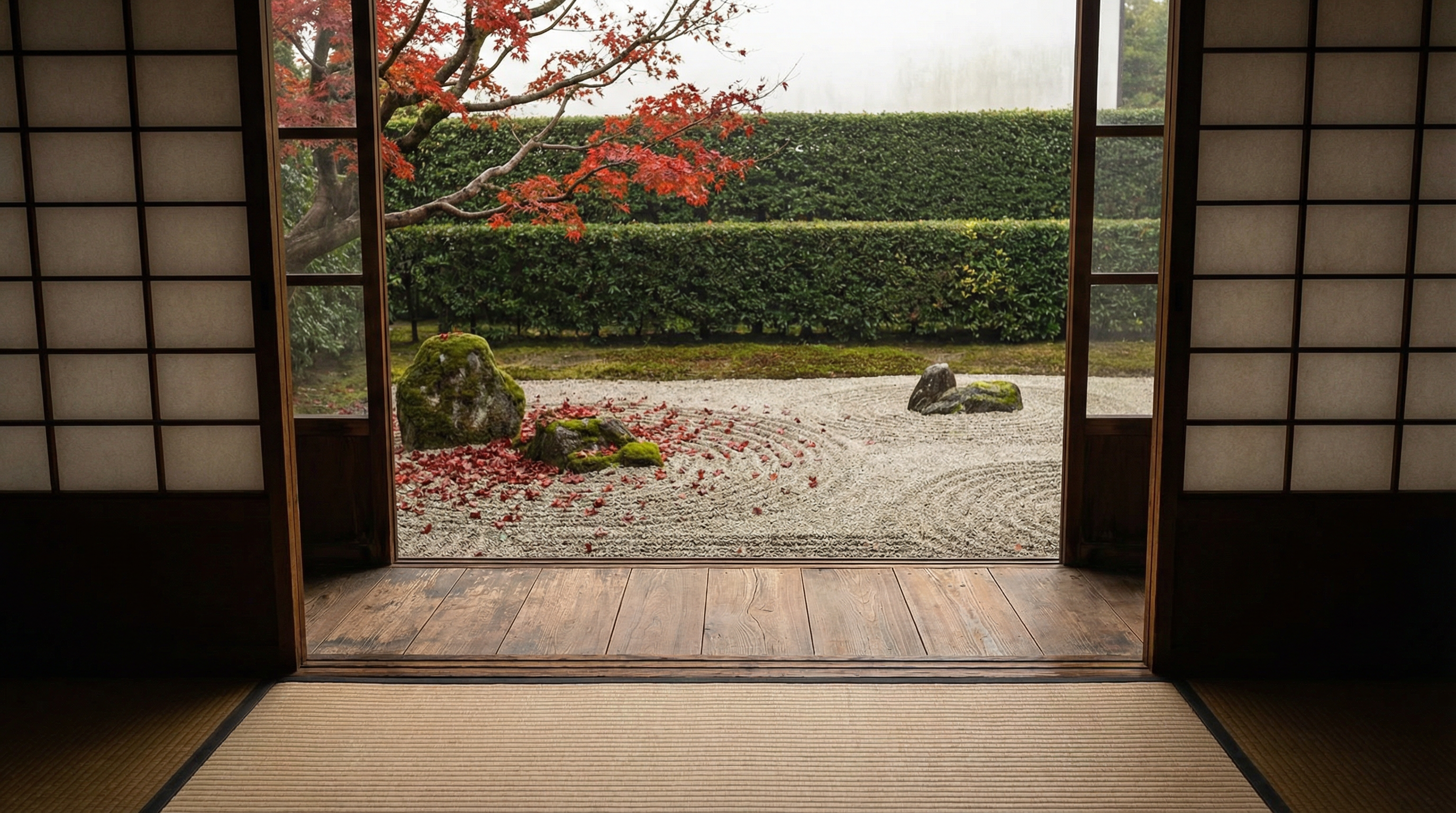 A Japanese zen temple interior, seen from the engawa veranda looking through open shoji screens at a karesansui dry rock garden. Tatami floor in the near ground, wooden threshold in the mid ground, raked gravel with circular patterns around three stones in the far ground, clipped hedge wall at the back. The shoji screen uprights create a frame-within-frame. Late autumn — a single red maple branch extends from the left, fallen leaves on the gravel. Soft overcast light. 45mm, f/8. Negative: people, bright sun, text, watermark.