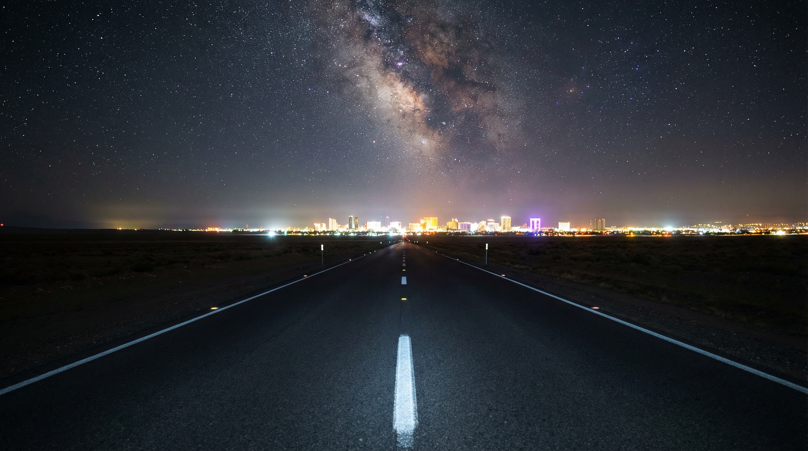 A straight road cuts through flat desert toward a distant city, seen from 20 miles away at night. The city is a cluster of light on the horizon — white, amber, neon colors — shimmering in released heat. The road's white center line stretches from camera to the lights. On either side: flat dark nothing. The sky is packed with stars, the Milky Way visible as a bright band. Reflective road markers catch starlight. 14mm, f/2.8, ISO 6400, 15-second exposure. Negative: cars, people, light pollution, text, watermark.