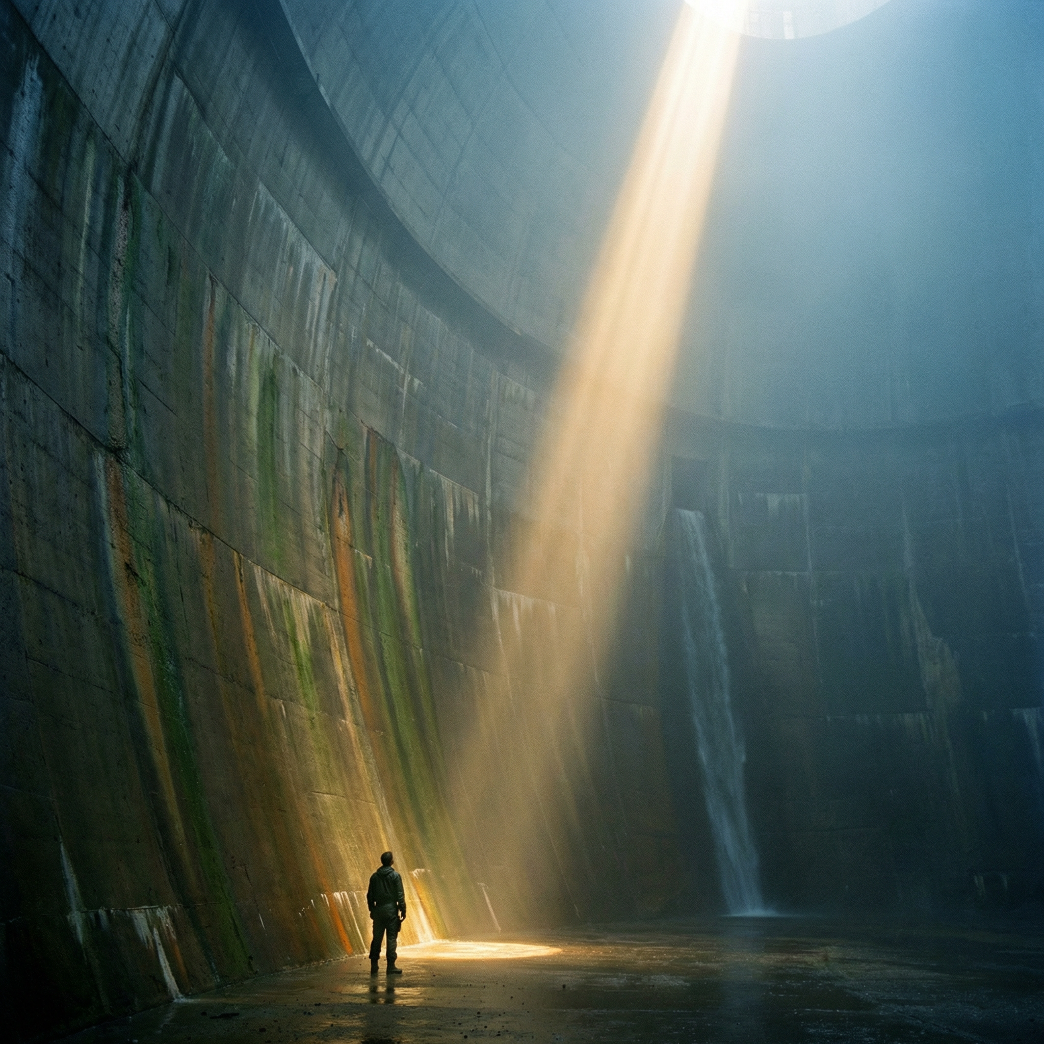 SHOT: • Composition: Wide establishing shot, a lone figure dwarfed by a massive architectural structure • Camera: ARRI Alexa 65, Panavision Sphero 65 24mm T2.8, IMAX-scale framing • Aspect: 1.43:1 IMAX SUBJECT: • Character: Small figure in dark utilitarian clothing, standing at the base of an enormous curved concrete wall that extends upward and out of frame • Scale: The figure occupies less than 5% of the frame area — this is about the architecture, not the person SCENE: • Location: Interior of a decommissioned dam or water treatment facility — brutal concrete geometry, curved walls stained with mineral deposits, a thin waterfall trickling down the far wall • Atmosphere: Fog or mist at ground level, reducing visibility beyond 50 meters LIGHTING: • Key: A single shaft of daylight enters from an opening high above (not visible), falling as a column of light through the mist — the figure stands at the edge of this light shaft • The light beam is visible due to the mist, creating volumetric rays • Everything outside the shaft is in deep shadow, lit only by scattered bounce from the wet concrete COLOR: Cool blue-grey concrete, warm golden shaft of light, green mineral stains on walls STYLE: Denis Villeneuve / Roger Deakins — Blade Runner 2049 Wallace Corporation interiors, Arrival language chamber, Dune Arrakeen architecture. The sublime scale of brutalist structures dwarfing a human figure.