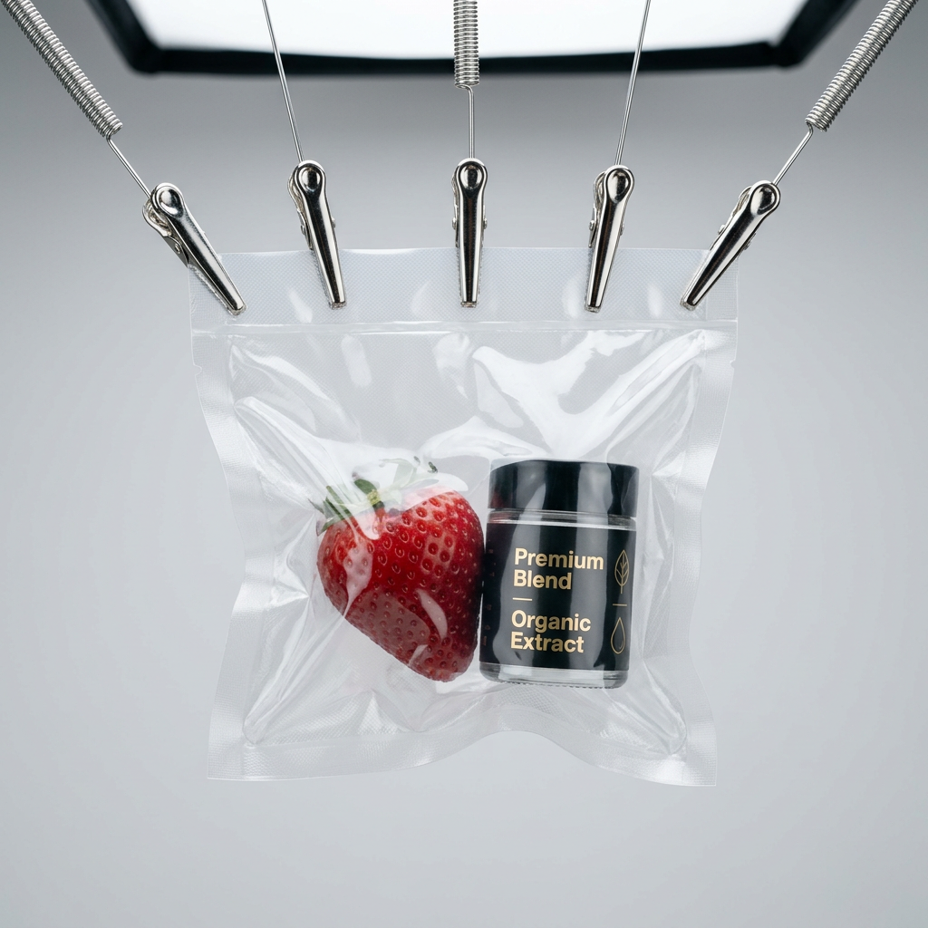 SHOT: • Composition: Centered close-up shot of vacuum-sealed package suspended by metal clips against plain background • Camera Settings: Canon RF 100mm f/2.8L Macro lens, f/16 aperture for maximum sharpness, daylight balanced, no motion blur • Film Grain: None, clean digital clarity with Kodak Portra 400 color science LENS EFFECTS: • Optics: High definition focus on packaging texture and objects inside • Artifacts: Minimal reflections on plastic surface • Depth of Field: Deep focus capturing entire package and contents clearly SUBJECT: • Description: Transparent vacuum-sealed plastic pouch containing a fresh red strawberry and a small black and silver cylindrical container labeled with gold text • Wardrobe: None • Grooming: None SCENE: • Location: Studio setup with controlled lighting and neutral background • Time of Day: Indeterminate artificial lighting • Environment: Minimalistic, clinical VISUAL DETAILS: • Action: Package suspended mid-air by five metal clips with thin wires and springs, no movement • Props: Five shiny chrome alligator clips attached to coiled and straight wires holding the package • Physics: Package tautly stretched creating texture and reflections CINEMATOGRAPHY: • Camera Body: Sony A1 with Canon RF mount adapter • Lighting: Butterfly lighting setup with key light positioned above center, fill light at 45 degrees, soft box diffusion minimizing shadows and highlighting texture • Tone: Cool and clinical, sleek modern • Color Palette: Neutral grey background, transparent with black, gold text, red strawberry TEXT ELEMENTS: • Visible Text: "Premium Blend" and "Organic Extract" in gold, additional minimalist iconography • Typography: Modern sans-serif font, clean and legible • Placement: Text on black container centered within package SKIN REALISM: Highly realistic skin texture with visible pores, natural micro-imperfections, slight blemishes, no smoothing, no beauty filter, no airbrushed or plastic skin texture. NEGATIVE: airbrushed skin, plastic texture, waxy face, over-smoothing, beauty filter, CGI skin STYLE: • Visual Aesthetic: Minimalist product photography with emphasis on clarity, texture, and modern design