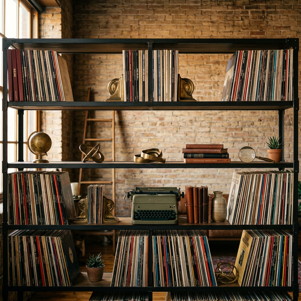 SHOT: • Composition: Straight-on wide shot, industrial shelving unit spanning frame width, vintage vinyl records and sculptural objects evenly distributed • Camera Settings: ISO 200, f/5.6, 1/60 s, controlled studio light • Film Stock: Kodak Portra 400 emulation with warm color grading LENS EFFECTS: • Optics: Zeiss Supreme Prime 35mm mounted on ARRI Alexa 35, sharp focus throughout depth of shelves • Artifacts: None • Depth of Field: Deep focus showing details on all shelf levels with slight falloff at rear SUBJECT: • Description: Multiple black metal shelves with curated collection of vinyl records in varied sleeve designs, vintage typewriters and brass sculptural pieces positioned between and alongside records • Wardrobe: none • Grooming: none SCENE: • Location: Industrial loft space with exposed brick wall behind shelving unit • Time of Day: Late afternoon • Environment: Sophisticated, curated, collector's studio setting VISUAL DETAILS: • Action: Records displayed vertically in rows, vintage objects arranged asymmetrically, decorative brass items catching side light • Props: Sculptural elements include brass bookends, vintage globe, leather-bound journals, records with varied colored sleeves in blacks, golds, deep reds, and earth tones • Physics: Directional side-lighting highlights metallic finishes and record textures, creates dimensional shadows CINEMATOGRAPHY: • Lighting: Rembrandt lighting technique with single key light from left, warm diffused fill from right, creates dimensional modeling without harshness • Tone: Warm, nostalgic, sophisticated • Color Palette: Charcoal metal, warm brass accents, deep record sleeve colors in burgundy, navy, burnt orange, cream TEXT ELEMENTS: • Visible Text: Vinyl record titles and artist names, indistinct due to angle and depth • Typography: Varied vintage typography across record sleeves • Placement: Records aligned vertically with spines facing outward, text primarily on sleeve edges SKIN REALISM: Highly realistic skin texture with visible pores, natural micro-imperfections, slight blemishes, no smoothing, no beauty filter, no airbrushed or plastic skin texture. NEGATIVE: airbrushed skin, plastic texture, waxy face, over-smoothing, beauty filter, CGI skin STYLE: • Visual Aesthetic: Minimalist modernism with retro-industrial charm, curated collector's aesthetic