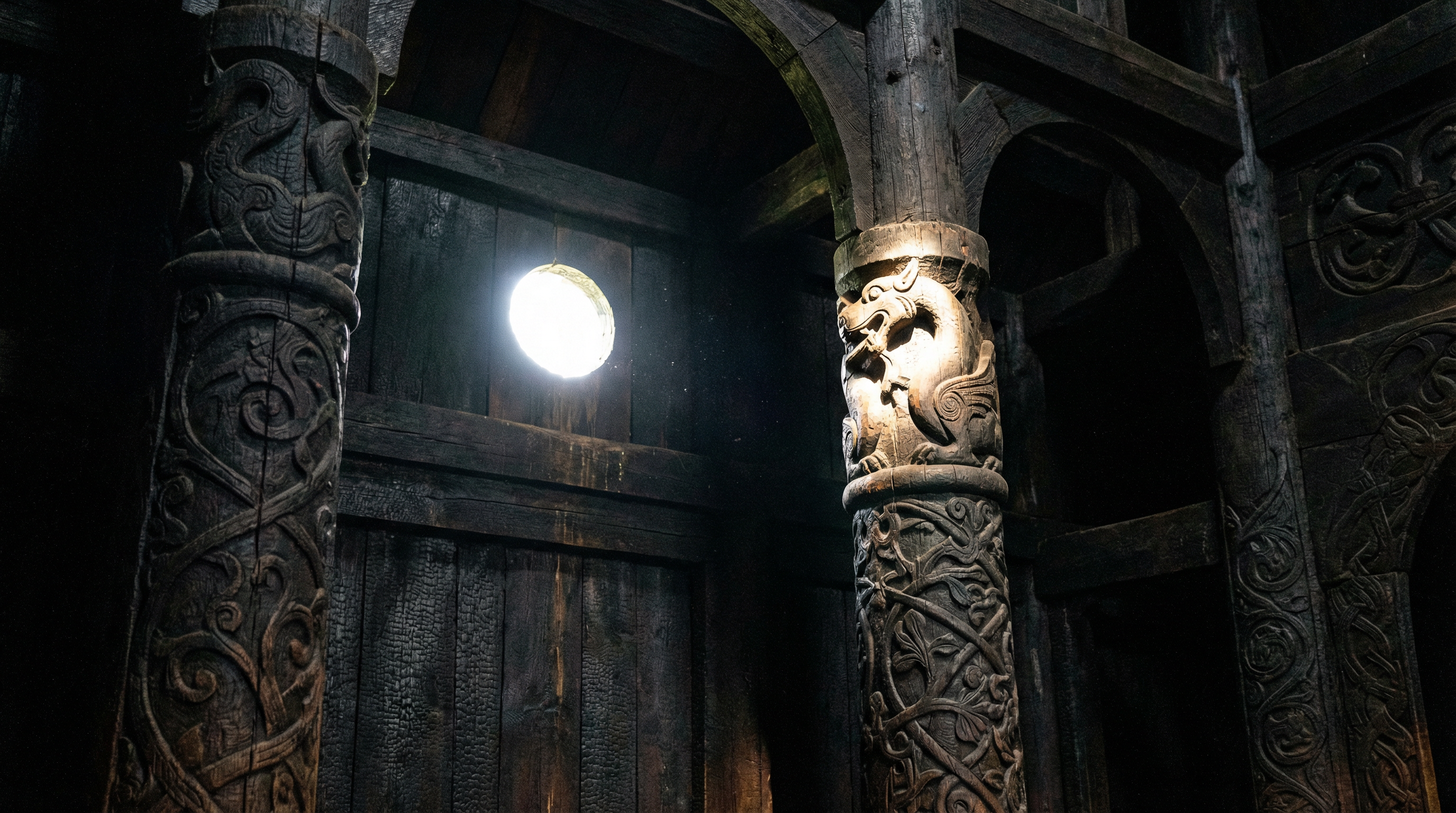 Inside a wooden stave church in Norway. The entire structure is dark carved wood with interlocking dragon and vine patterns. The wood is 800 years old and black with tar preservation. A single disc of daylight from a tiny circular wall opening illuminates one carved dragon head on a column capital. Tight growth rings visible in the 800-year-old posts. Shot on Sony A7S III, 40mm f/1.2, ISO 12800 — pushing low-light limits without flash. Negative: flash, bright, modern, electric lights, text, watermark.